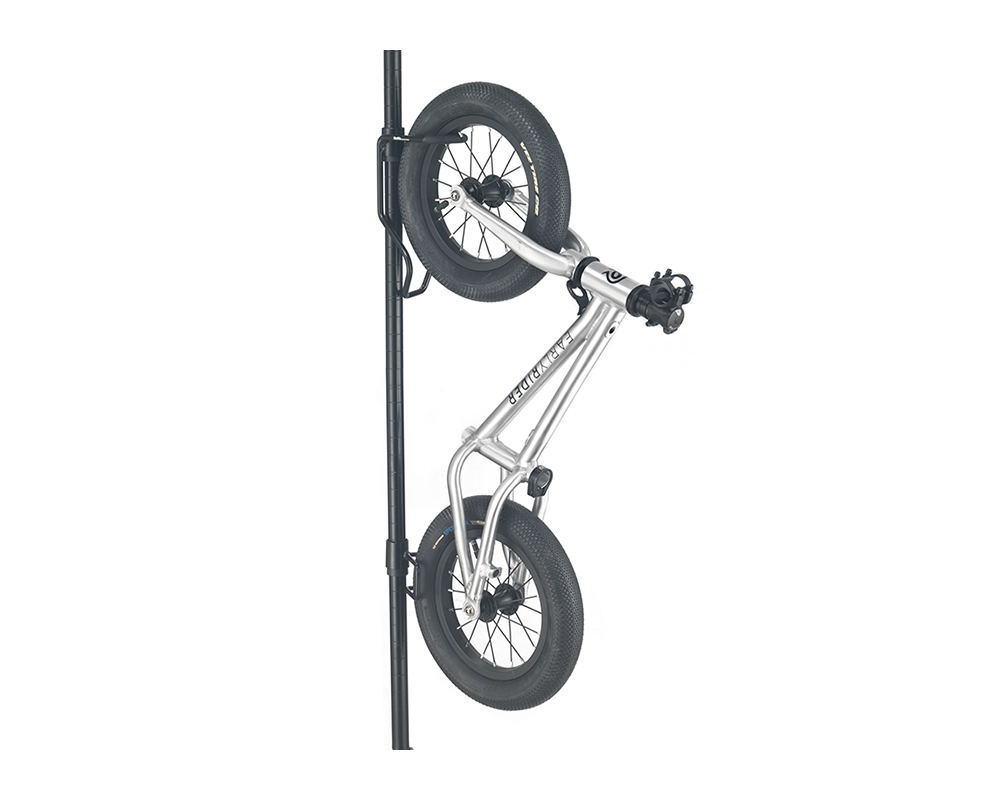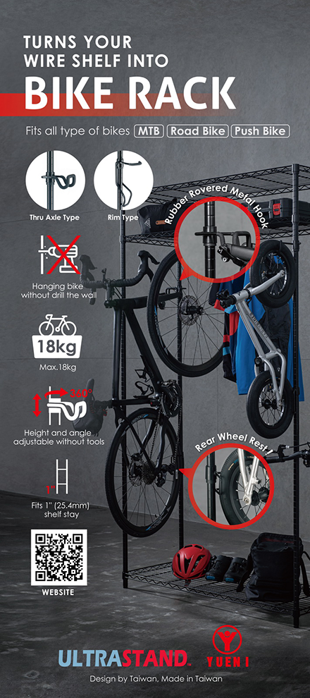 • Patent design hanger provide hanging bike by front wheel on shelf.
